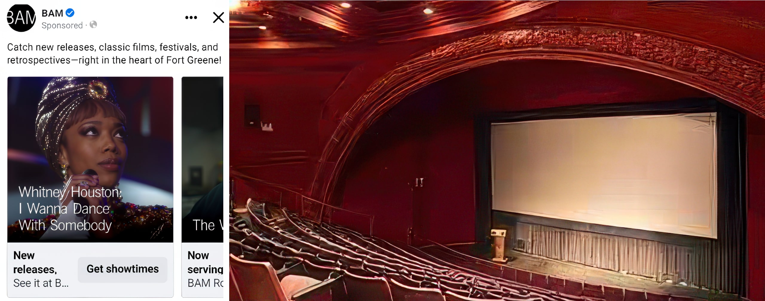 Our goal was to promote the latest new releases currently on screen at BAM to a hyper-local audience in the immediate BAM vicinity. Using Meta’s zip code targeting, we set up an ongoing campaign aimed at people who live or are currently visiting the Fort Greene area. There is no other interest targeting layered on, the goal is just to reach anyone who may be nearby and allow Meta’s optimization tools to do the rest of the work in finding qualified audiences for us.